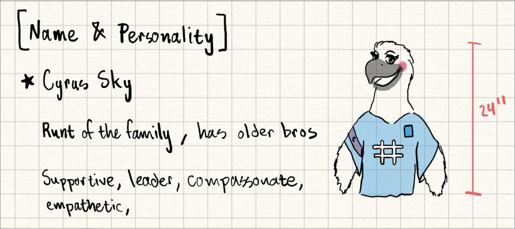 Cyrus is a baby Philippine Eagle. Because she’s bigger than everyone, she plays sports and teaches children to be aware of their surroundings. As an above-average sized human, this is an important thing to teach.